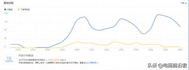 实时这个板块可以看到店铺支付金额、访客数、支付子订单数、支付买家数在每个时间段的数据情况。这个板块还可以对比前一天每个时间段的数据,如果今天的数据对比昨天的数据有所下滑的话,就需要去思考下滑的具体原因。