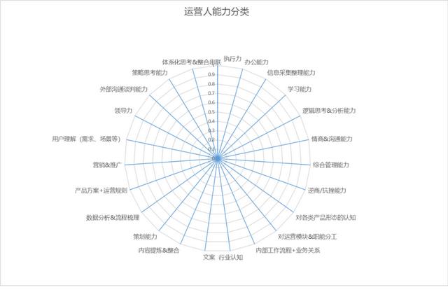 以上就是判断一个运营人能力的主要考核维度了。然后,我们可以把这些能力全部放到一张图里,也就是我们常说到的运营人能力雷达图: