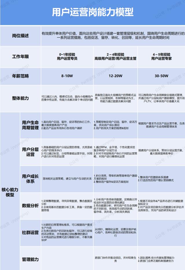 - 核心能力包括:文案能力、活动策划、用户运营、数据分析、管理能力以及商业洞察能力。