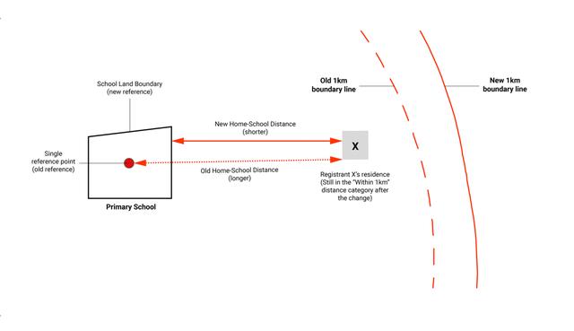根据新的就近入学距离算法,住家的学校距离的参照点,可以是“学校范围界线“(School Land Boundary)上的任何一个点,再向外扩散2公里以内。而不是原有的以学校原有建筑中的单一参照点为圆心,向外扩散2公里以内。