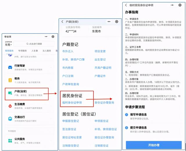 (二)省内临时身份证网上办。本省户籍居民在换领、补领居民身份证期间,急需使用居民身份证的,可以网上申请领取临时居民身份证。网办流程为:登录“粤省事”小程序,选择户籍地市,访问“户政(治安)服务”,找到“居民身份证-临时居民身份证申领”进行申请,领取方式可以按需选择“现场领取”或者“邮政速递”,户籍地公安机关在收到申办申请之日起3个工作日内完成制证,属邮寄领取的并将证件寄出。