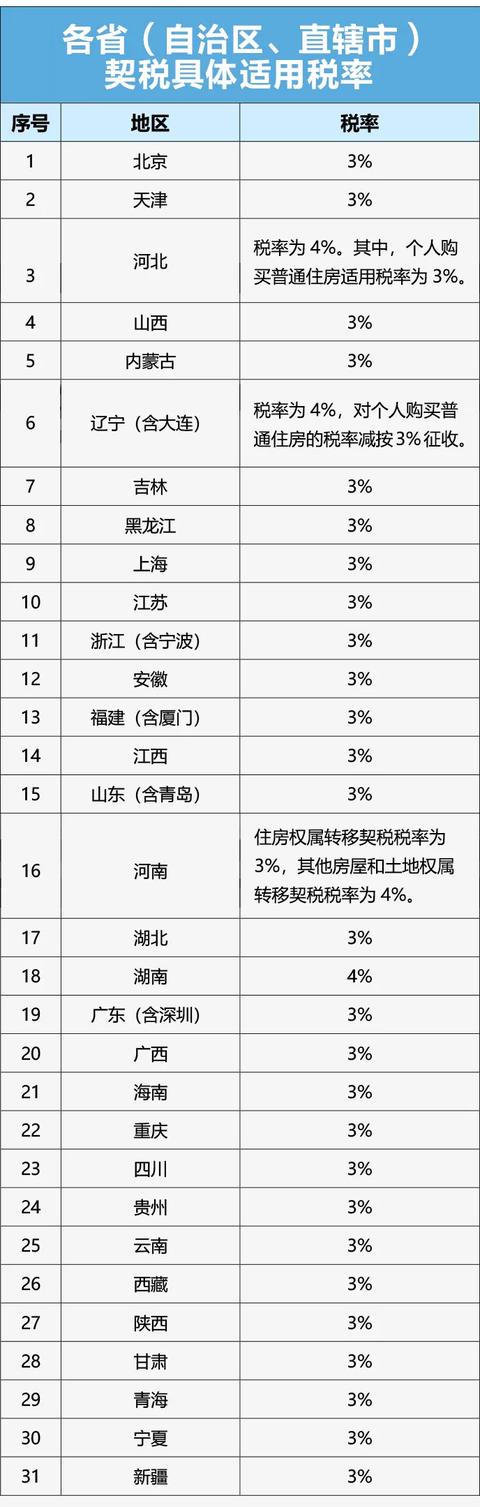 小编梳理各地授权事项决定后发现,对于契税适用税率,有27个省、自治区、直辖市确定为税法规定的最低水平,即3%;湖南省确定为4%;河北省契税适用税率为4%,其中个人购买普通住房适用税率为3%;辽宁省契税税率为4%,对个人购买普通住房的税率减按3%征收;河南省住房权属转移契税税率为3%,其他房屋和土地权属转移契税税率为4%。