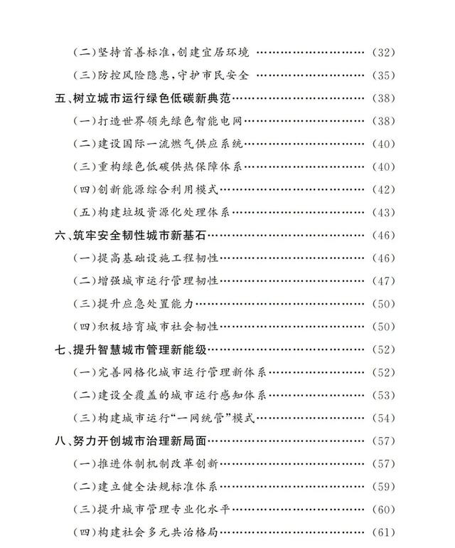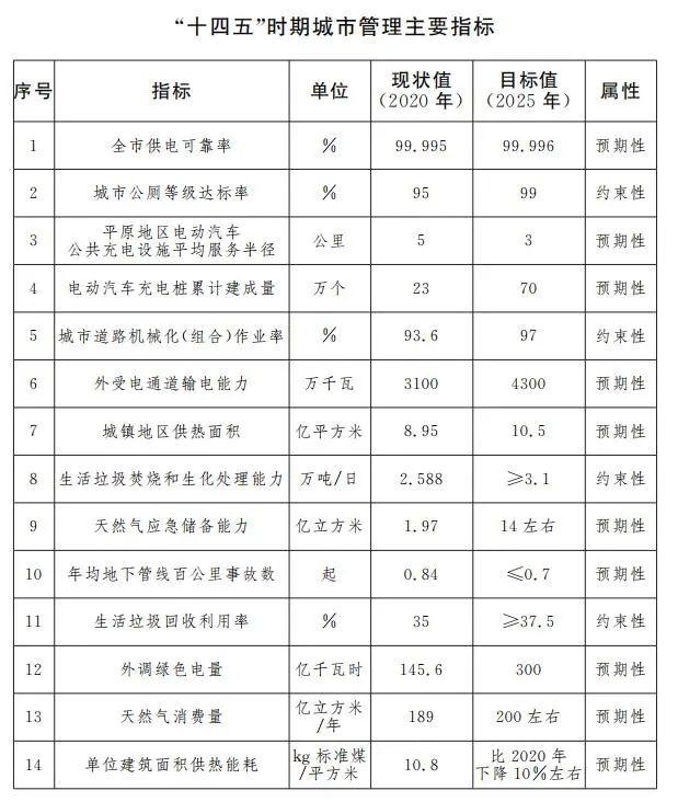 城市运行保障体系更加安全、高效、清洁、低碳,服务保障能力显著提升。补齐市政基础设施能力短板,并形成一定裕度。外受电通道输电能力达到4300万千瓦,本地发电装机容量达到1533万千瓦(含应急备用电源),城镇地区供热面积达到10.5亿平方米,生活垃圾焚烧和生化处理能力达到3.1万吨/日以上(焚烧处理能力达到2.2万吨/日以上、生化处理能力达到0.9万吨/日以上),全市电动汽车充电桩累计建成量达到70万个。生产生活方式绿色低碳转型全面推进,电能消费占终端能源消费比重力争达到29%,外调绿色电量力争达到300亿千瓦时,天然气消费量控制在200亿立方米/年左右,生活垃圾回收利用率达到37.5%以上,实现原生生活垃圾“零填埋”。