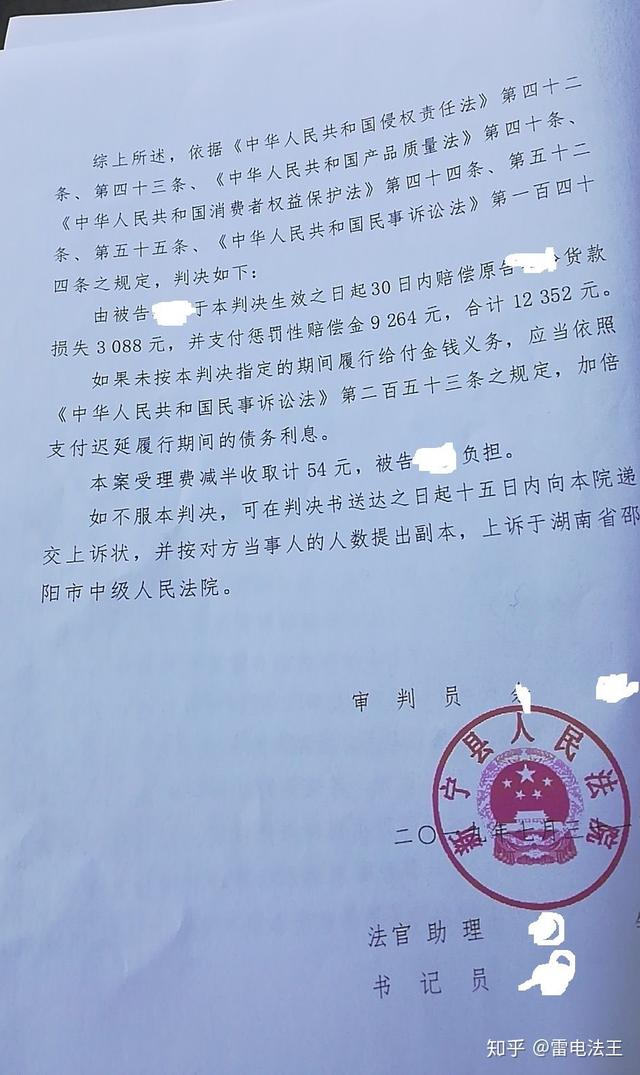 5.终于等到一审开庭。法院调整了案由,为产品责任纠纷。被告没来、法院缺席审理。法庭调查,原告按照起诉状从头读到尾。法官问了几个问题。包括:1.被告的身份信息是否淘宝网提供。2.被告户籍地在武汉,为什么邮寄地址在云南,两者有什么联系?等。我没想到法院直接当庭宣判:支持退一赔三。庭后我方提供了手机序列号。