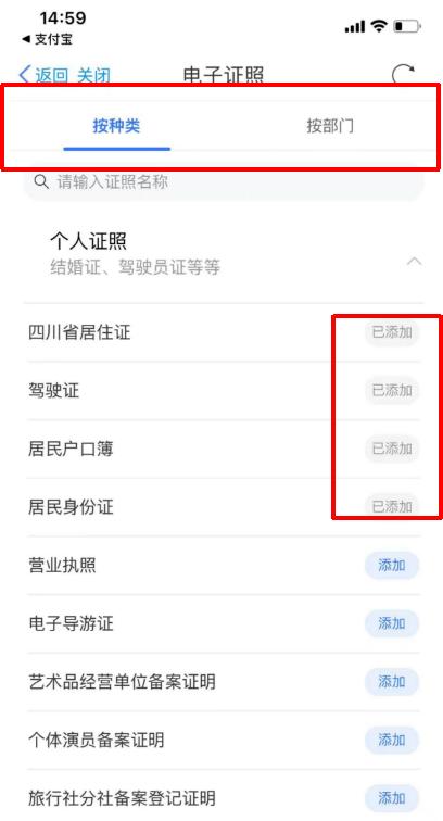(4)进入证照列表,“按种类”或“按部门”添加需要的证照。