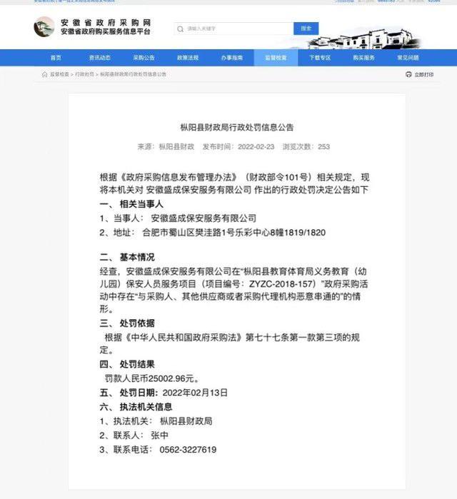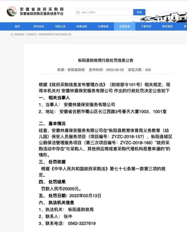 据枞阳县财政局2月23日该处罚显示,1、经查,安徽林盾保安服务有限公司在“枞阳县教育体育局义务教育(幼儿园)保安人员服务项目(项目编号:ZYZC-2018-157)、枞阳县城区公厕保洁管理服务项目(第三次项目编号:ZYZC-2018-166)”政府采购活动中存在“与采购人、其他供应商或者采购代理机构恶意串通的”的情形。 根据《中华人民共和国政府采购法》第七十七条第一款第三项的规定,决定罚款人民币25000元。