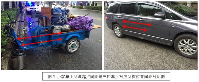 7.根据痕迹1、2的小客车右前门上与三轮车左侧护杠碰撞形成的刮痕起点,到小客车右后门上与三轮车浅蓝色帆布的帐篷左侧端部碰撞形成的刮痕起点之间的水平距离AC≈ac、BC≈bc,表明三个接触点几乎是同时形成的(图5),结合小客车的速度高过三轮车一倍,所以符合是三轮车向小客车方向变道。