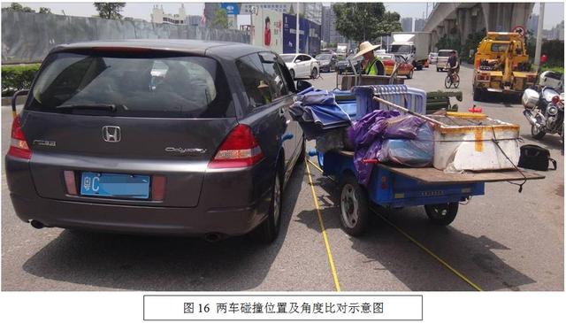 5.根据痕迹分析1~3中两车的碰撞形态,测量两车的碰撞角度约为20°(图16)。
