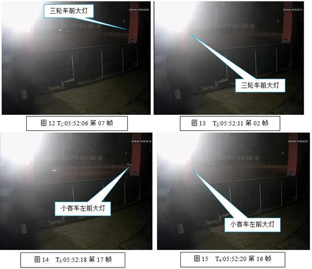 2.关键点的选取:视频一中截取T1:05:52:06第07帧(图12),三轮车前车灯露出工地右侧门柱左侧边;T2:05:52:11第02帧(图13),三轮车前车灯中部正对工地左侧门柱右侧边;T3:05:52:18第17帧(图14),小客车左前大灯中部正对工地右侧门柱左侧边;T4:05:52:20第16帧(图15),小客车左前大灯中部正对工地左侧门柱右侧边。