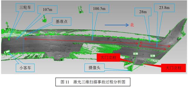 事发现场位于XX市XX区XX路由北往南方向行驶至XX路段,该路段为双向四车道,沥青路面,结合现场照片及现场图(图10):以现场由北往南方向路边的灯柱为基准点,以现场由北往南方向路边路缘石沿线为基准线。现场以北约100m路东,一工地大门内有监控摄像头,监控画面可见工地大门两侧的门柱。对事故现场进行了激光三维扫描,经测量监控画面内门柱内所能观测到的南行方向东侧车道中间距离为23.8m、西侧车道中间距离为28m(图11)。基准点为距大门南侧门柱观察线100.5m路灯杆,西侧路缘石为基准线,三轮车前车轮紧靠于距基准点12.9m以南的西侧路缘石上,右后轮距基准点12.6m,距基准线1.1m;小客车右前轮据基准点17.3m,据基准线11.7m,右后轮距基准点15m,距基准线10.9m,在小客车停止位置西北侧约4m的北行方向的西侧车道内见三轮车的驾驶员的左鞋遗留,距基准线8.3m(图10)。