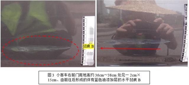 2.根据小客车右前门距地高约36cm~38cm处见一2cm×15cm、由前往后形成的伴有蓝色油漆加层的水平凹痕B的高度和形态,结合三轮车驾驶座前方距地高36cm~38cm的左侧下护杠外端球形凸起b有减层擦痕的高度和形态,小客车右前门上的凹痕B应系三轮车驾驶座前方的左侧下护杠外端球形凸起b碰撞所形成。