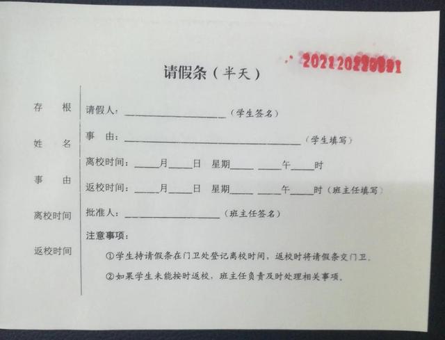 学生请半天假相对于请全天假比较简单。前面的过程和请全天假一样,只是班主任不用写4张,1张就够了,也不用去寝管处盖章。