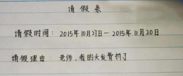 这位同学就以“头发骨折了”为理由请假,确定这不是来搞笑的吗?老师看到你这样的请假理由恐怕是直接驳回了,还要被拎出来批评一顿吧!下次请假的时候好歹想出个合理的理由来呀!
