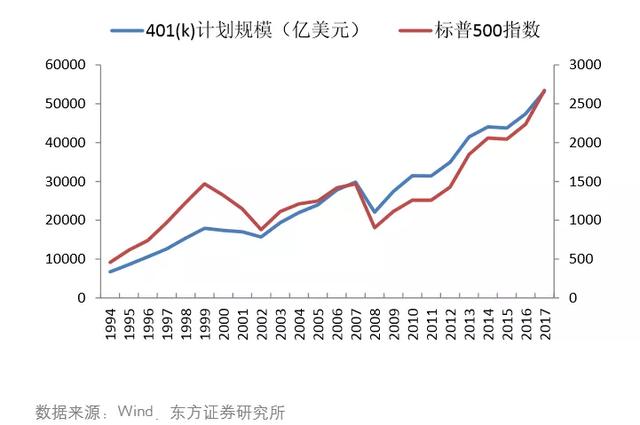 与此同时,401(K)计划的大发展也促使美资本市场不断走向成熟,资本市场的长期投资价值不仅直接推动 401(K)计划资产规模的持续扩张,还间接起到普及投资者教育、提高养老金计划参与率的作用。从 1994年至 2017 年,美标普 500 指数与 401(K)计划规模的相关性高达 0.92。