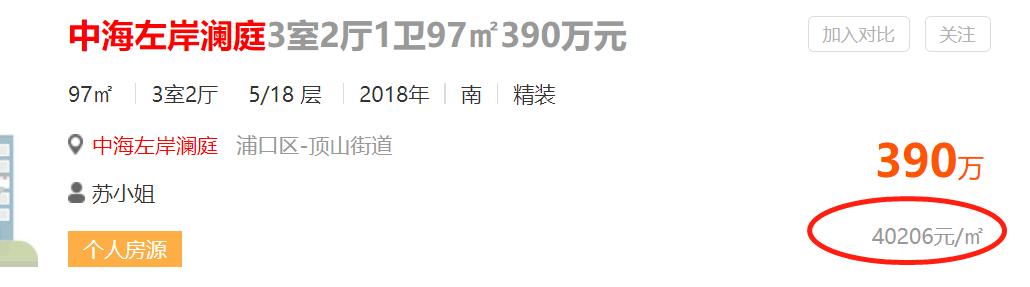 (4)中海左岸澜庭,这是一套个人房源,我看了一下是今天刚挂的,5楼,97平米390万,单价4万/m²