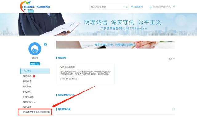 入口二:进入广东法律服务网(http://gd.12348.gov.cn),登录后进入“个人中心”,点击“律师管理系统律师侧子系统(律师入口)”。