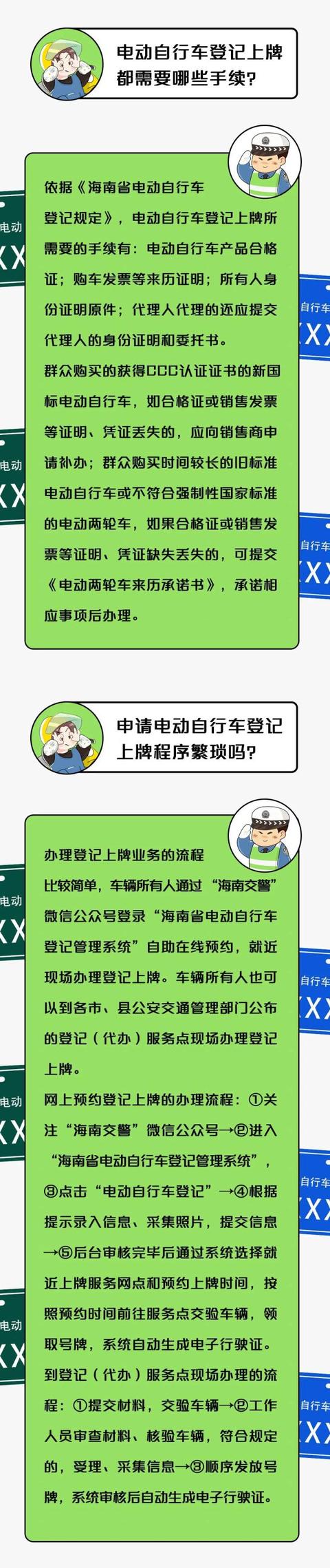 车辆所有人通过“海南交警”微信公众号登录“海南省电动自行车登记管理系统”,在线预约后就近现场办理登记上牌。办理形式由各市县自行确定公布。
