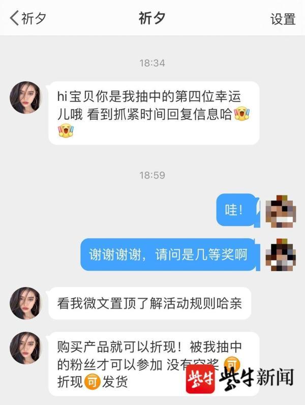 抱着试探的态度记者也对抽奖活动进行了转发并关注了博主,约半个小时后,该博主果然私信称记者成为“第四名幸运儿”并表示看到后要抓紧回复信息。“购买产品就可以折现,只有被抽中的粉丝才可以参与,百分百中奖。”该博主也直截了当告诉记者,要花钱买他的产品才可兑奖,产品有化妆品、鞋子和手表等物品,标价普遍在三四百元左右。