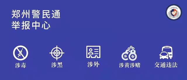 郑州警民通“举报中心”接受交通违法、涉黑、涉外、涉毒、涉黄涉赌等5类6种违法线索的举报。