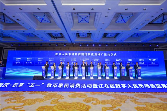 启动仪式上,按照《数字人民币重庆市试点工作实施方案》要求,围绕通用场景和特色场景建设,江北区与京东科技控股股份有限公司,江北区观音桥商圈办、江北嘴中央商务区管委办与11家银行机构,8家数字人民币运营银行与重庆市商业综合体运营商分别签订互联网企业场景、特色商圈场景、零售商超场景的应用推广合作备忘录,开展数字人民币消费场景、支付结算、个人钱包开立等应用推广工作。
