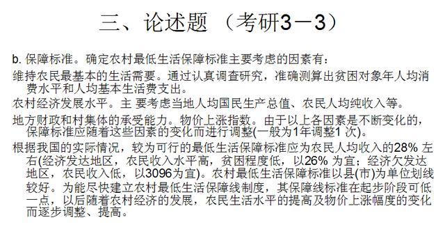 b. 保障标准。确定农村最低生活保障标准主要考虑的因素有: