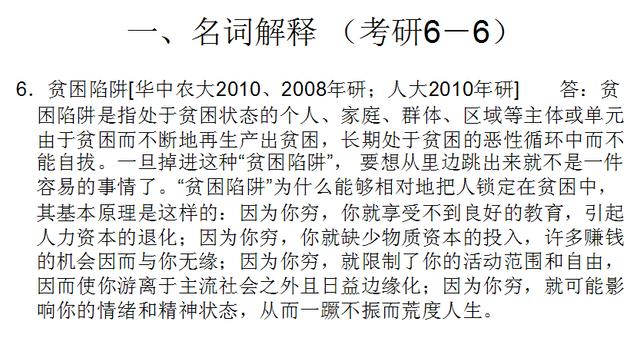 6.贫困陷阱[华中农大2010、2008年研;人大2010年研] 答:贫困陷阱是指处于贫困状态的个人、家庭、群体、区域等主体或单元由于贫困而不断地再生产出贫困,长期处于贫困的恶性循环中而不能自拔。一旦掉进这种“贫困陷阱”, 要想从里边跳出来就不是一件容易的事情了。“贫困陷阱”为什么能够相对地把人锁定在贫困中,其基本原理是这样的:因为你穷,你就享受不到良好的教育,引起人力资本的退化;因为你穷,你就缺少物质资本的投入,许多赚钱的机会因而与你无缘;因为你穷,就限制了你的活动范围和自由,因而使你游离于主流社会之外且日益边缘化;因为你穷,就可能影响你的情绪和精神状态,从而一蹶不振而荒度人生。