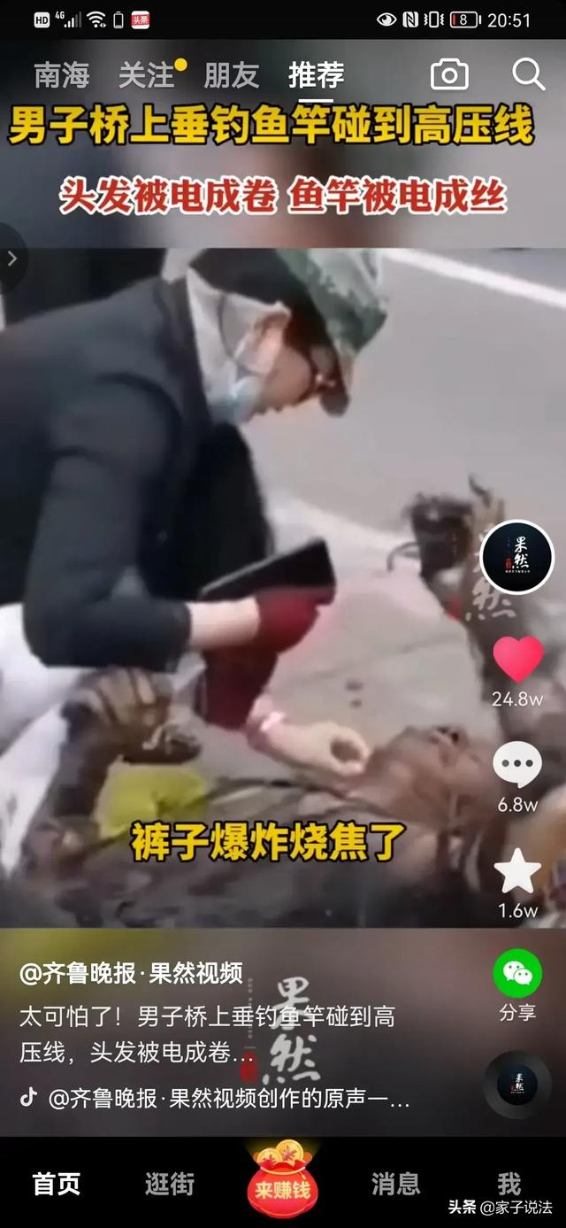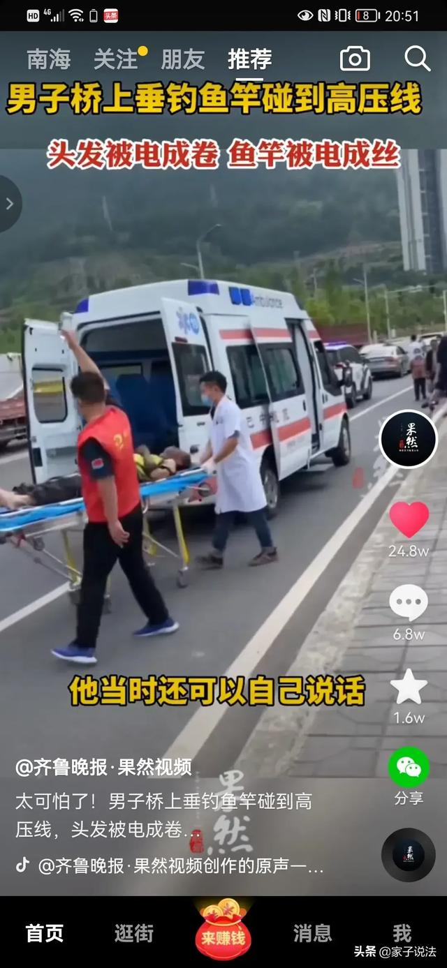 “砰!人飞了,鱼竿变棉絮了!”四川巴中,一名男子抛竿钓鱼时,整个人被电的浑身焦黑。有目击者称,现场发出巨大的声响,“以为是汽车爆胎了”,结果发现一名男子躺在地上。事发后,男子仰面躺在桥上,身上的衣服都被高压电融化,只剩下几块布粘着,碳纤维鱼竿被炸成棉絮状。男子在地上不停挣扎,周围有群众赶上去救助,与受伤男子对话,对方还有应答,身体还有比较明显的动作。群众拨打急救电话后,男子被送往当地医院。医院工作人员说,目前这名男子已被送往重症监护室,“抢救希望不大,但我们会尽力。”(大象新闻客户端)