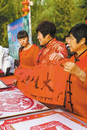 整个民俗展演中最具喜庆味道的当属剪纸表演,大红的剪纸象征红火美好的生活。在该县曹柏舍村曹俊巧的剪刀下,一张张剪纸栩栩如生,一张应景的赵州桥剪纸精美绝伦,引得游客啧啧称奇。今年62岁的曹俊巧是赵县出名的“巧手”,剪纸的技艺出自家传,她的姥姥和妈妈也都是剪纸高手。“这幅字是我刚剪好的,祝愿祖国繁荣富强!”曹俊巧打开红纸,一张花团锦簇的“喜迎十九大”剪纸呈现在游客面前,表达出赵县人民对十九大胜利召开的热切期盼。