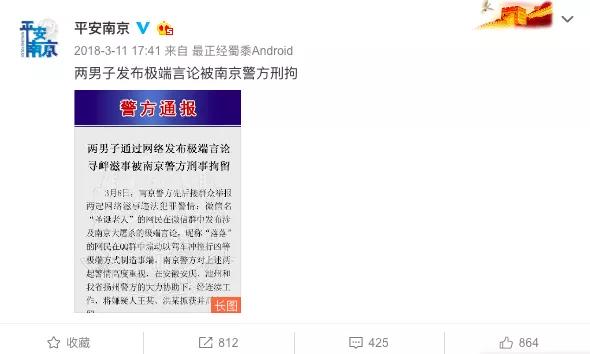 南京市公安局高度重视,立即开展调查,于2月19日晚将发布违法言论的仇某某(男,38岁,南京人,网名“辣笔小球”)抓获。目前,南京警方已对仇某某以涉嫌寻衅滋事罪刑事拘留。