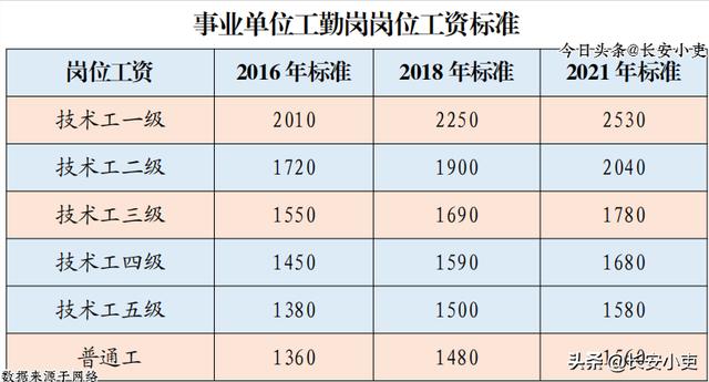 三、事业单位工勤人员总增资额如果你是事业单位专技岗工作人员,按2021年或者2018年总体调资的增资额为: