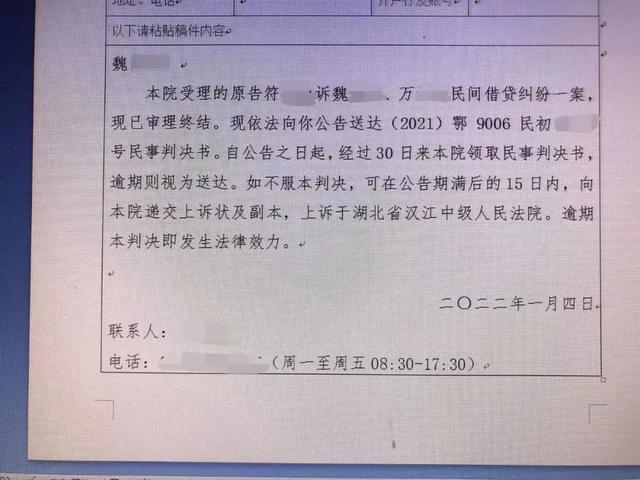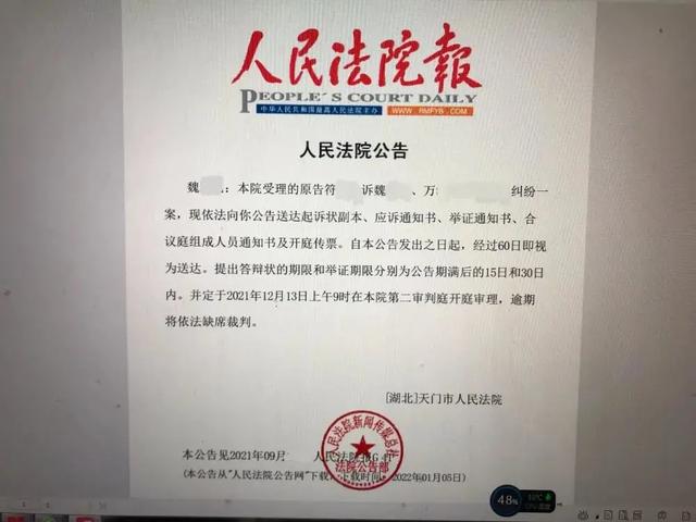2021年8月,符某与魏某、万某之间因借款引发民间借贷纠纷,符某为维护自身合法权益,将魏某、万某诉至天门法院。在审理过程中,承办法官通过电子送达、邮寄送达等方式均无法与魏某取得联系。后经魏某户籍所在地村委会确认,魏某已搬出多年,符合公告送达条件,天门法院依法对魏某进行公告送达,并于2021年9月在人民法院报刊登。