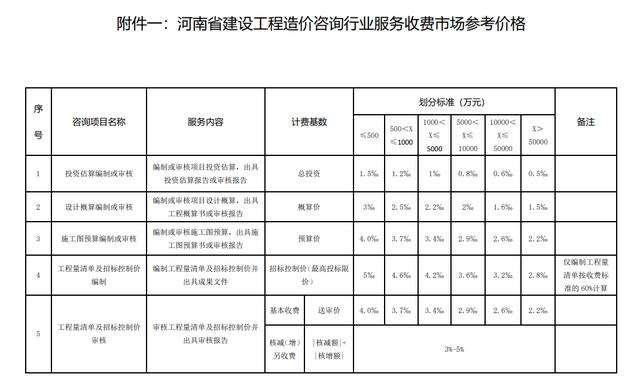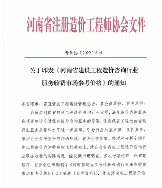 仅隔半月之久,河南省便率先发文,印发《河南省建设工程造价咨询行业服务收费市场参考价格》,作为河南省工程造价咨询服务项目收费的参考依据,同时对全国其他地区具有一定的借鉴意义。