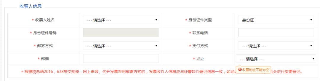 收票人姓名可以选择已完成实名登记的法人、财务负责人、办税人和购票员。身份证件类型和身份证件号码系统自动带出,不可修改。选择办税服务厅领取、自助机和自助取票柜领取时,邮寄方式、支付方式、邮编和地址会屏蔽。选择邮寄时则需要填写支付方式、邮编和地址。