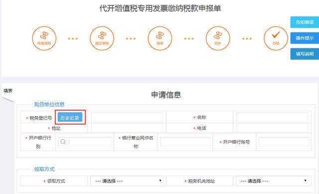 输入购货单位纳税人识别号,系统自动带出其余信息,如果信息不符,可自行修改;如果购货单位为外省单位,购货单位其余信息需要纳税人自行手动填写,也可以点击历史记录,系统自动带出纳税人之前成功代开过的购货单位信息,纳税人可以根据需要选择。