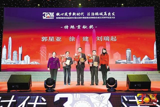 ▲2018年12月18日,在深圳市律师协会成立30周年纪念大会上,郭星亚(左二)荣获特殊贡献奖。