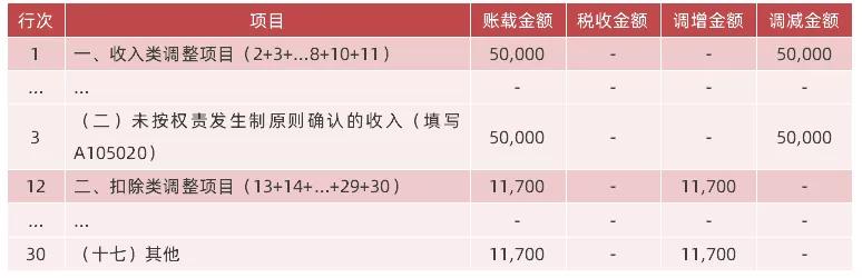 收入的调整需在A105000第3行“未按权责发生制原则确认的收入”栏次中填报,由于企业所得税的年度纳税申报表没有专门设计成本、税金项目的纳税调整表格,所以需要统一在A105000第30行“其他”栏次中进行其他调整项的填列。具体填报列示如下: