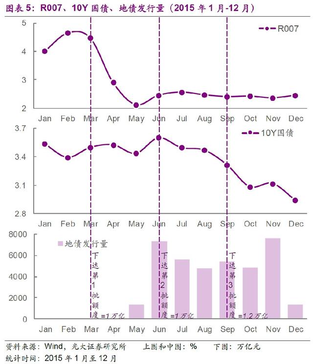 大海航行靠舵手!人民银行灵活运用各类货币政策工具,保持流动性合理充裕,引导降低融资成本;财政部对各地发债规模和节奏进行了必要的组织协调;相关部门协调金融机构加大通过定向发行债券方式置换的力度。15年2月时,R007还在4.65%的位置,到9月时已经下降至了2.41%,此时,财政部已经悄然下达完了三批置换债额度,累计3.2万亿元。