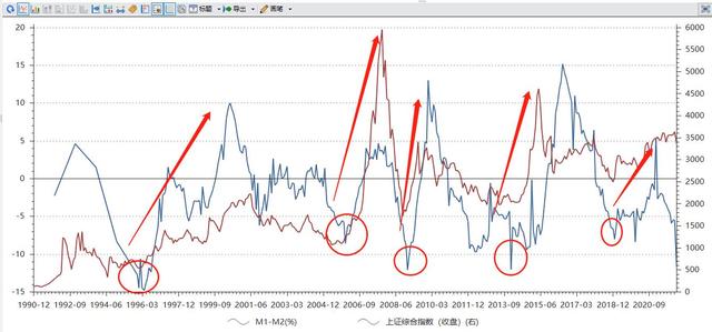 从历史上来看,M1-M2剪刀差对于预测A股的涨跌参考意义挺大,历史上M1-M2剪刀差极端拉大以后,都迎来了不错的大反弹行情,这一次会不一样吗?