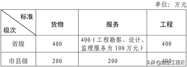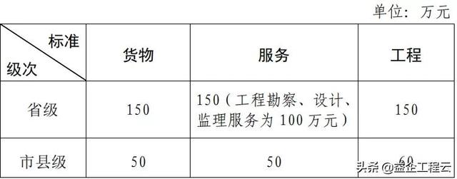 货物、服务类项目:省级100万元;市级50万元;县级30万元。