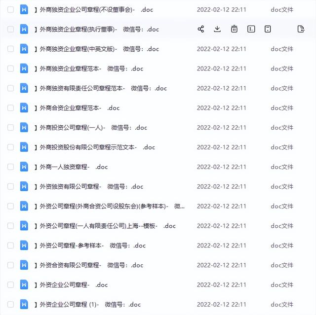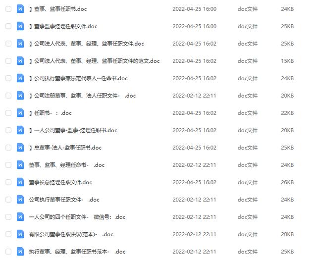 有限公司章程,150份。外资公司章程,38份。合资公司章程,67份。股份公司章程,101份。独资公司章程,61份。董事,监理,法人代表任职书,15份。一人公司章程,36份。