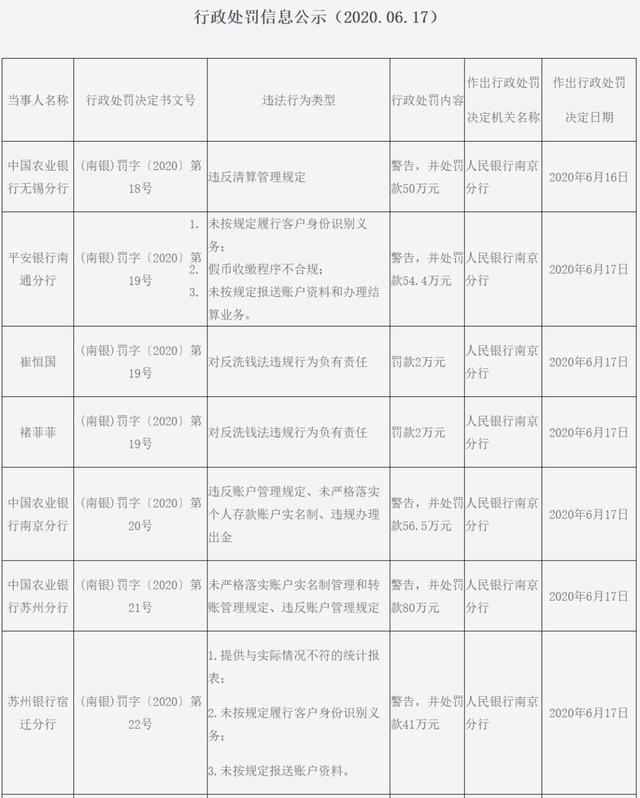 例如,6月24日,中国人民银行南京分行发布的行政处罚信息显示,多家银行因反洗钱不力被处以警告并吃了罚单。其中平安银行南通分行未按规定履行客户身份识别义务等违规行为被罚54.4万元,2名相关负责人对反洗钱法违规行为负有责任,分别罚款2万元;中国农业银行南京分行、苏州分行因违反账户管理规定、未严格落实个人存款账户实名制等分别被处罚款56.5万元、80万元;苏州银行宿迁分行因未按规定履行客户身份识别义务被处罚款41万元,2名相关负责人分别罚款1万元。