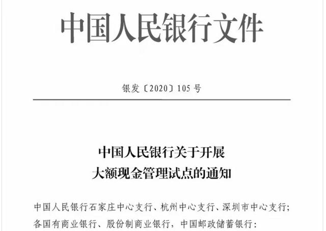 早在2019年11月,央行就公布了《关于在河北省、浙江省、深圳市试点开展大额现金管理的通知(公开征求意见稿)》。要求从现金流通的角度,建立健全大额现金服务与管理措施,合理设立大额现金管理的金额起点,采取银行存取、交易收付和收入申报以及现金出入境等环节相关措施,不断提升大额现金管理水平。