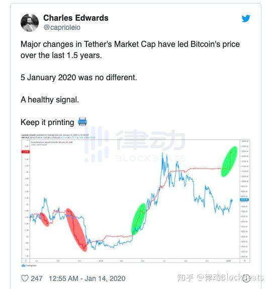 正如 CryptoSlate 之前报道的那样,数字资产经理查尔斯·爱德华兹 (Charles Edwards) 在今年 1 月表示,「在过去的 1.5 年里,Tether 的市值发生了重大变化,导致了比特币的价格上涨。」律动获悉,当 BTC 在 2 月中旬上涨至 10,500 美元的高位时,这个观点似乎被印证了。此外,根据律动了解,在 2018 年 11 月 BTC 从 6000 美元暴跌至 3150 美元的近 50% 崩盘之前,USDT 的流通金额下降了数亿美元;此外,在 2019 年上涨 330% 之前,Tether 也铸造了价值数亿美元的稳定币。