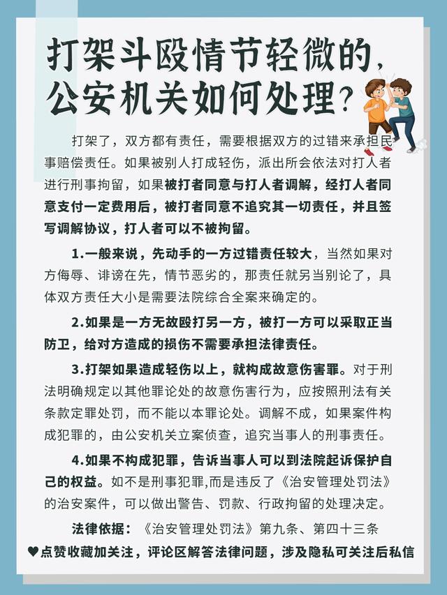 打架了,双方都有责任,需要根据双方的过错来承担民事赔偿责任。如果被别人打成轻伤,派出所会依法对打人者进行刑事拘留,如果被打者同意与打人者调解,经打人者同意支付一定费用后,被打者同意不追究其一切责任,并且签写调解协议,打人者可以不被拘留。