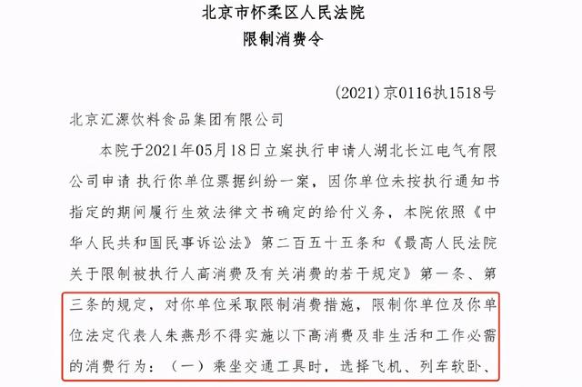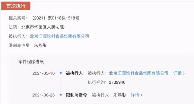 另外,北京汇源饮料食品集团有限公司的法定代表人为朱燕彤被限制高消费。