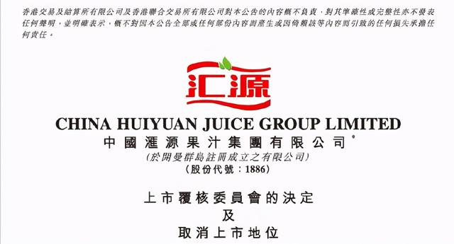 自2018年4月3日起开始停牌的汇源果汁,最终于2021年1月18日,汇源果汁被港股退市。港交所宣布,中国汇源果汁集团有限公司的上市地位将根据《上市规则》第6.01A条予以取消。一代“国民品牌”就此陨落。