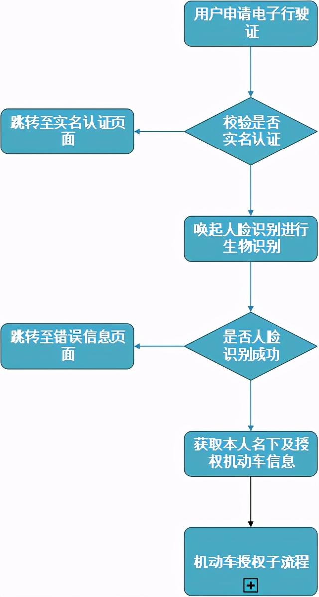 用户申请机动车行驶证电子凭证时,系统将根据实名认证信息唤起人脸识别,生物识别通过后系统跳转至机动车选择界面,系统将根据身份证明号码自动关联名下机动车行驶证与被授权过的机动车行驶证。