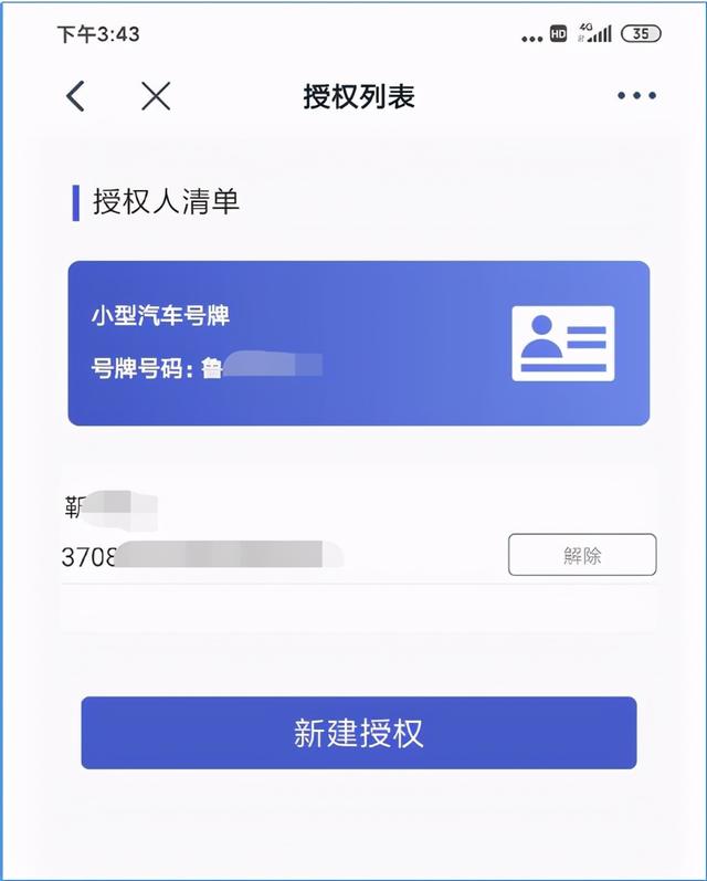 在进入到机动车行驶证电子凭证主页后,点击【授权管理】对行驶证进行授权管理。注意只有在行驶证本人、本车的页面才能进行授权。授权的验证方式可通过人脸验证或者短信验证,验证通过后输入被授权人身份证明号码,点击保存完成授权。验证通过后,用户需输入被授权人的身份证号码完成授权,被授权人必须具备有效的核发地是山东省的驾驶证,同一行驶证可授权于除本人之外的三个驾驶人。行驶证所有人可随时解除授权关系。如下图: