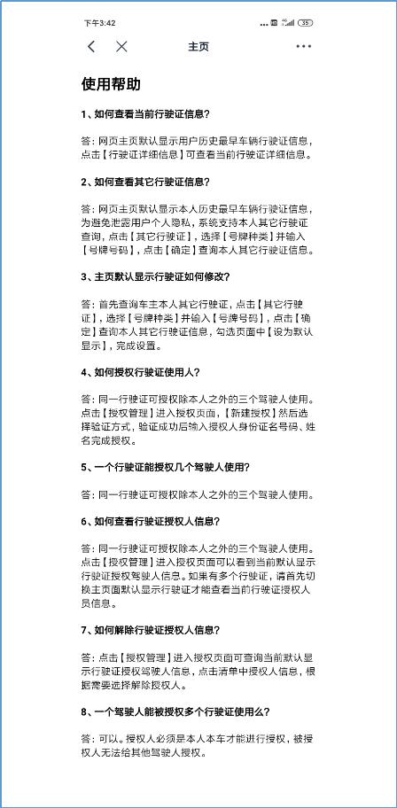 在进入机动车行驶证电子凭证主页后,点击【使用帮助】查看机动车行驶证电子凭证使用帮助,如下图: