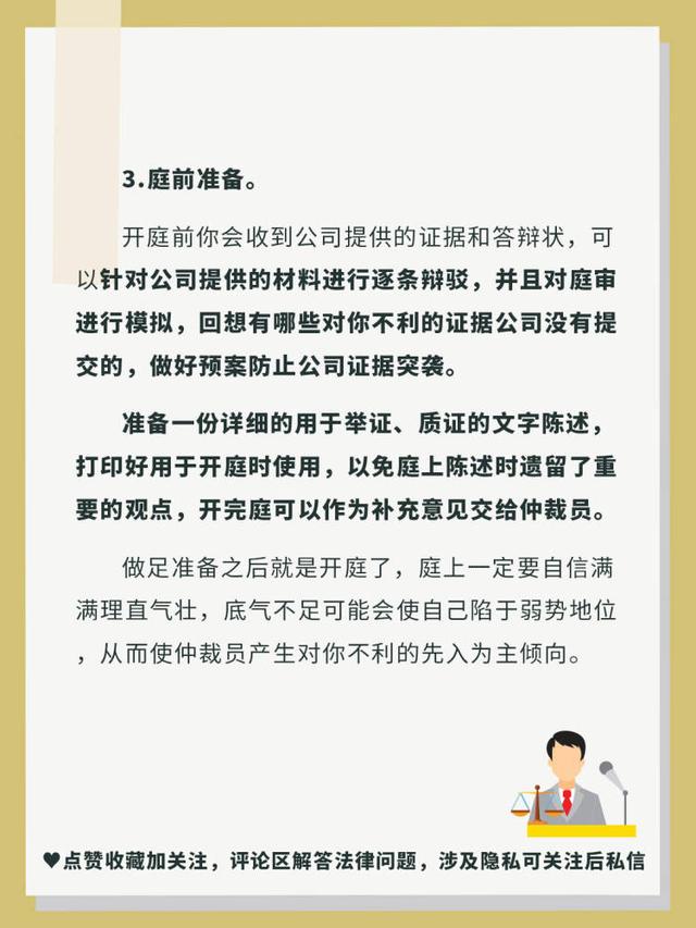 开庭前你会收到公司提供的证据和答辩状,可以针对公司提供的材料进行逐条辩驳,并且对庭审进行模拟,回想有哪些对你不利的证据公司没有提交的,做好预案防止公司证据突袭。